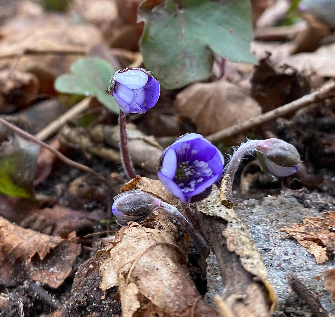 Vi hittade efter en stunds letande några exemplar av Hepatica nobilis, blåsippa. Kronbladen knöt ihop sig och visade sig knappt bland multnande fjolårslöv.