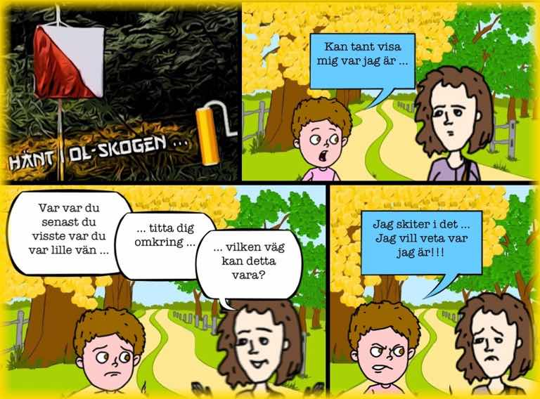 Tillvaron är inte alltid lätt när man blir tillfrågad/inkallad som finnas-till-hands när det är nybörjaraktiviteter och yngre förmågor ska skolas in i skogssporten. Överhörde häromdagen följande vittnesmål som omformats till en seriestrip: