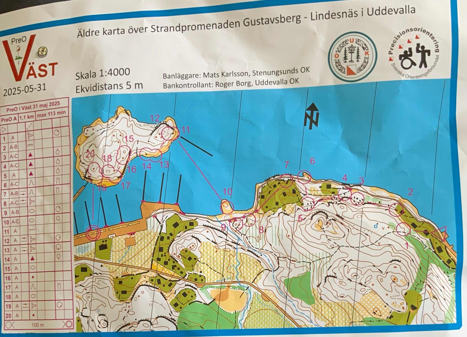 Ytterligare en dag med Precisionsorientering på programmet. Detta vid Gustafsberg i Uddevallas västra delar. De orangevita skärmarna var placerade i mycket kuperad sluttningsterräng. Kartan var uppförstorad från en vanlig orienteringskarta och för den här typen av aktivitet var den i mitt tycke schematisk och oexakt.