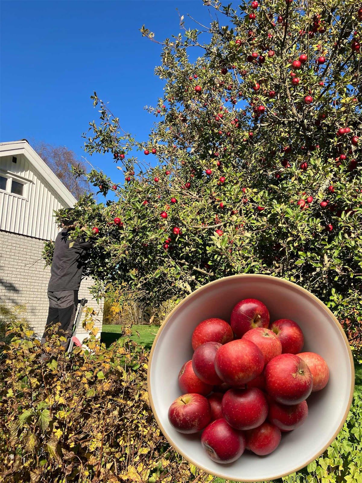 Den underbart härliga fredagen ägnades bland annat åt att plocka äpplen. Detta hos svågerns ena dotter där äppleträden bär rikligt med frukter. I år är äpplena ovanligt friska och goda ... ingen mask eller skrovliga skal.