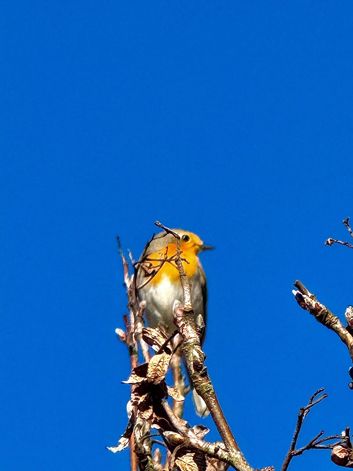 Det blev en härlig förmiddagsvandring i bergen öster om Nödinge när barnbarnen dragit till skolan. Så hördes den plötsligt, högt och intensivt ... en rödhake. Dess sång beskrivs ibland som en porlande bäck. Den har många klara toner med många tempoväxlingar. Ofta inleds sången med en hög ihållande ton.